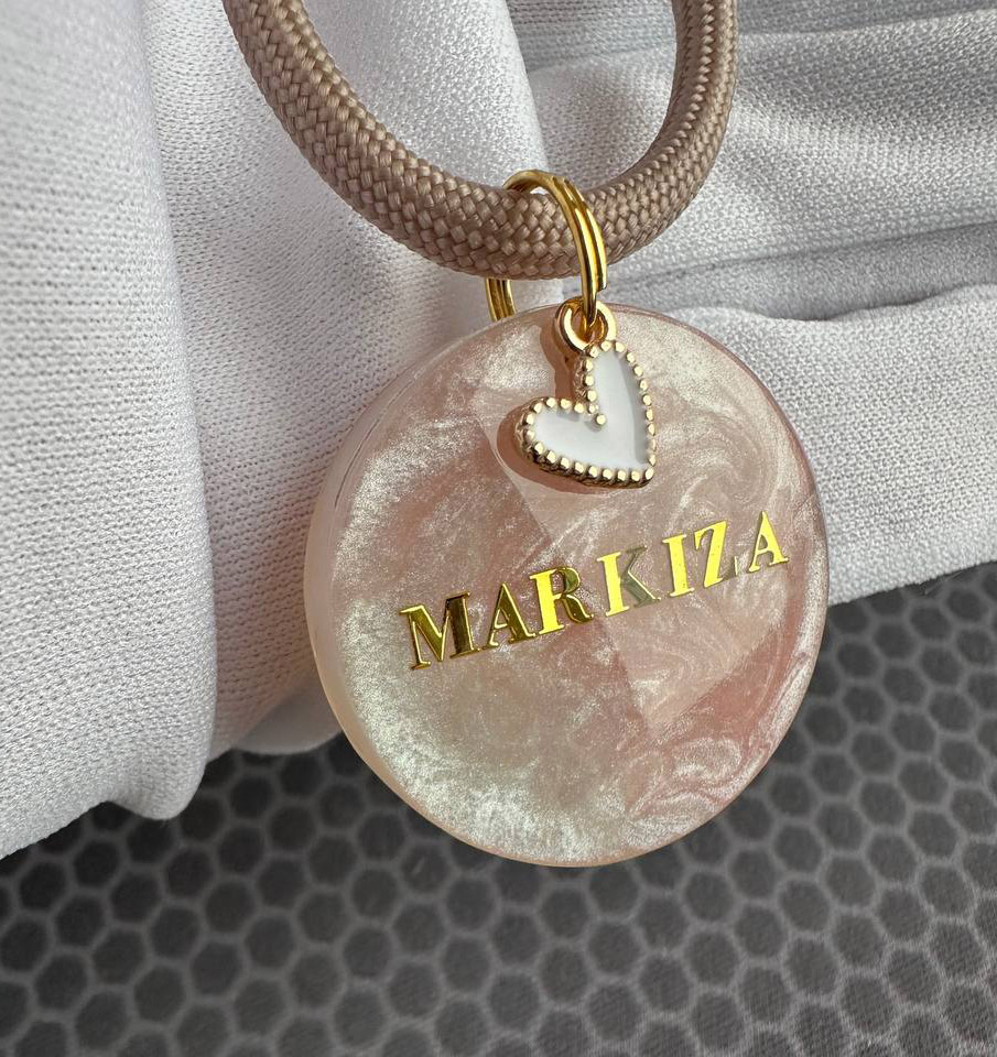 Имя питомца и ваш номер телефона на обратной стороне. По желанию — сердечко, значок или маленький декоративный элемент.